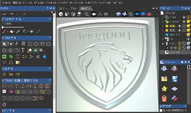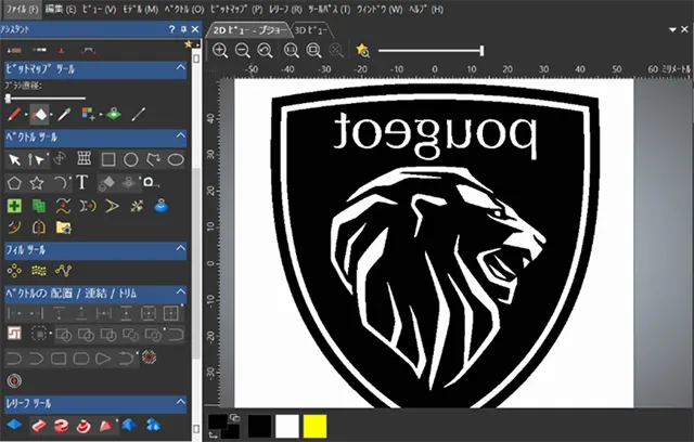 普通はこのようなブランドのロゴを勝手にものづくりに利用することはできませんが、Vビットで加工するには打ってつけの題材なのと、私もこの車のユーザーですから愛を込めてロゴをわざわざ誤字の別フォントに変えてライオンの毛並みにも手を加え、参考事例として作製手順を画面上でのみ作らせていただきます。