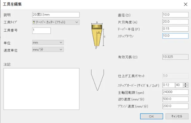 彫刻する輪郭が決まれば後は2Dツールパスの中から「彫刻加工ツールパスを生成」に進み、刃物を選定して加工深さを設定します。