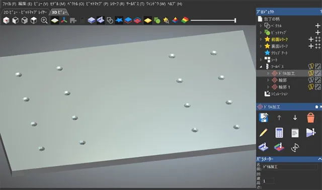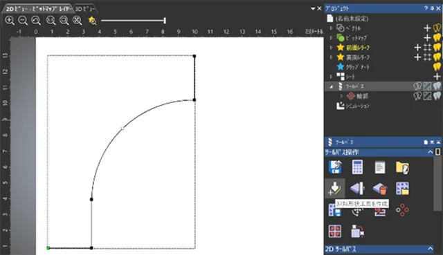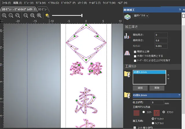 2Dツールパスから彫刻加工を選んで輪郭抽出した全データを選択ベクトルとして指定してツールパス生成をクリックします。