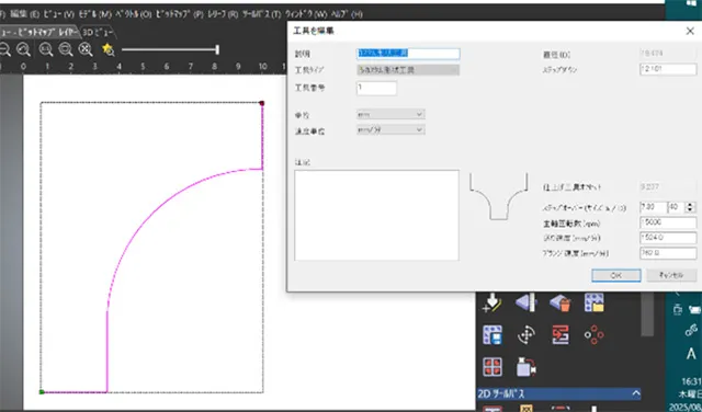 二次元CADの画面上に登録したい成形バイトの半身の断面図を描いて、カスタム工具登録のアイコンをクリックして各加工条件を入力して工具の名前を付ければそれで完了です。ほかの登録工具と同じように呼び出して利用することが可能になります。